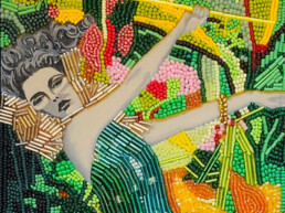Surrealist images mixed with art, fashion and abstraction. Made from different materials including antique beads from the Czech Republic. The skin areas have been painted with oil paint.